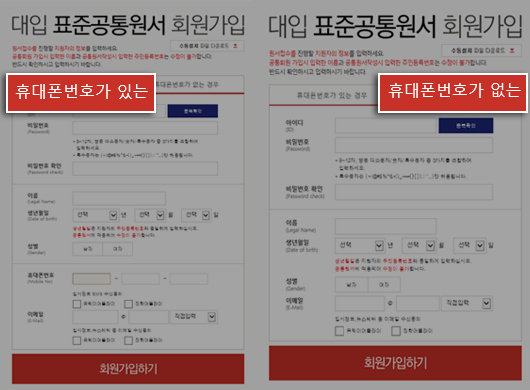- ȸ¿ø°¡ÀÔÀº ÈÞ´ëÆù¹øÈ£°¡ ÀÖ´Â °æ¿ì¿Í ¾ø´Â °æ¿ì·Î ³ª´µ¾î ÀÖ½À´Ï´Ù.
